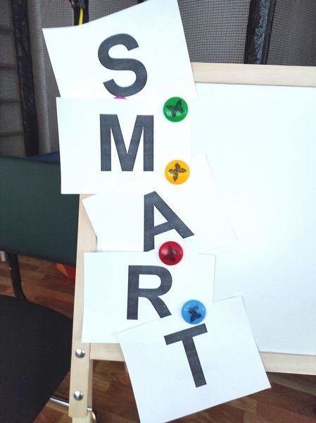 При формировании у ребенка с нарушениями развития навыков самообслуживания пример постановки задачи по методу SMART может выглядеть так: мальчик N. 2,5 лет категорически отказывается сидеть на горшке дольше трех секунд. Мы даем семье задание потренировать навык сидения по возможности в разных вариантах: и на горшке, и за столом, и в играх, а цель звучит так: